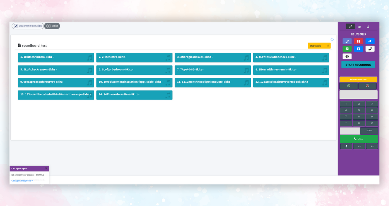 Our Soundboard Dialer Solution allows agents to use pre-recorded audio clips during live calls for clear communication. It improves efficiency, reduces language barriers, and ensures a professional experience. Ideal for telemarketing, debt collection, and compliance-driven industries.